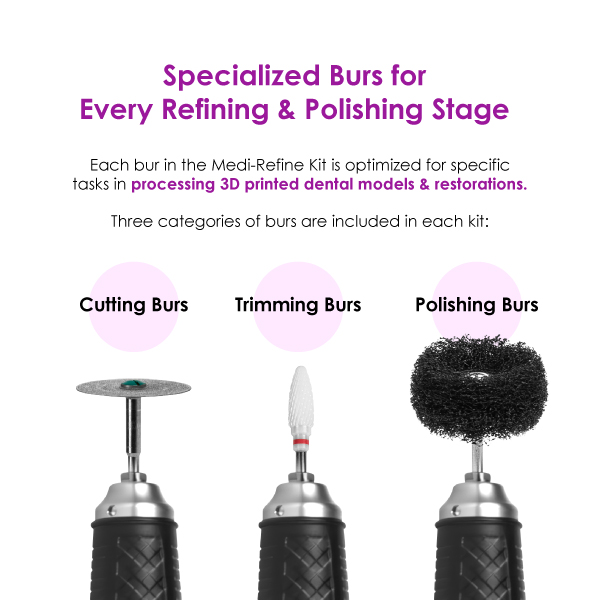 Each bur in the Medi-Refine Kit is optimized for specific tasks in processing 3D printed dental models and restorations, with recommended speeds for safe, effective performance.