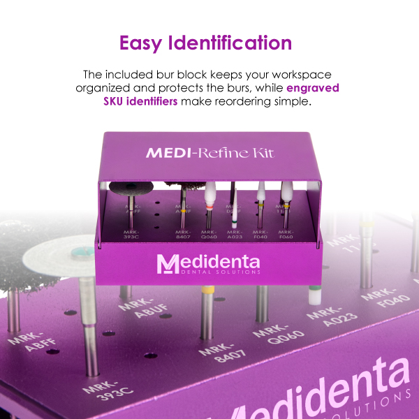 Whether removing supports, contouring anatomy, or achieving a final high-shine polish, the Medi-Refine Kit provides the right tool for every stage. The kit includes ten specialized lab burs and a sturdy bur block featuring engravings to identify each bur?s SKU, ensuring quick access and organized storage in busy dental labs.